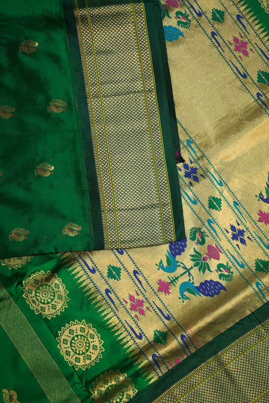9yard Handwoven Pure Paithani With Chakra Meena Buttis And Green Contrast