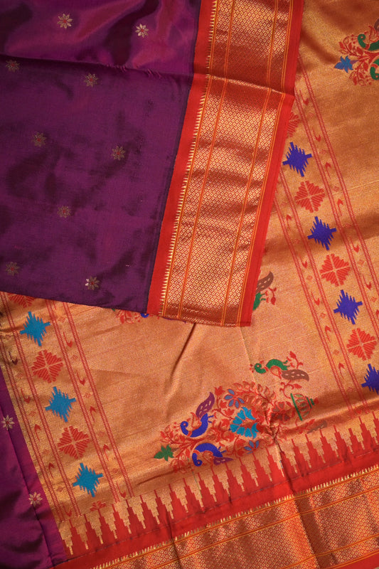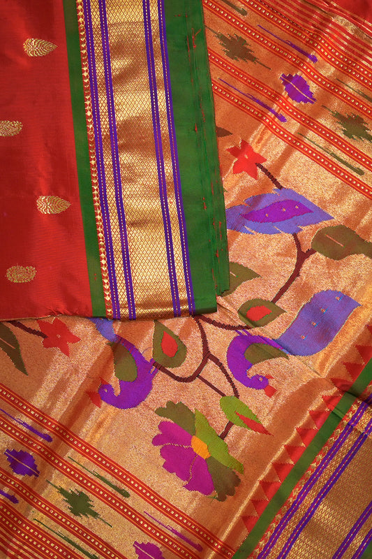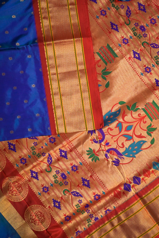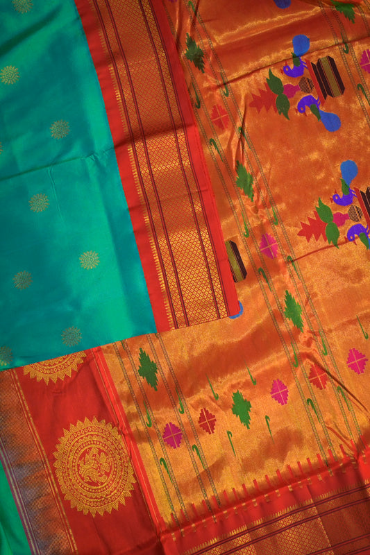 9yard Handwoven Pure Paithani With Peacock Jari Buttis And Red Contrast