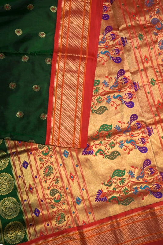 9yard Handwoven Pure Paithani With Chakri Buttis And Red Contrast