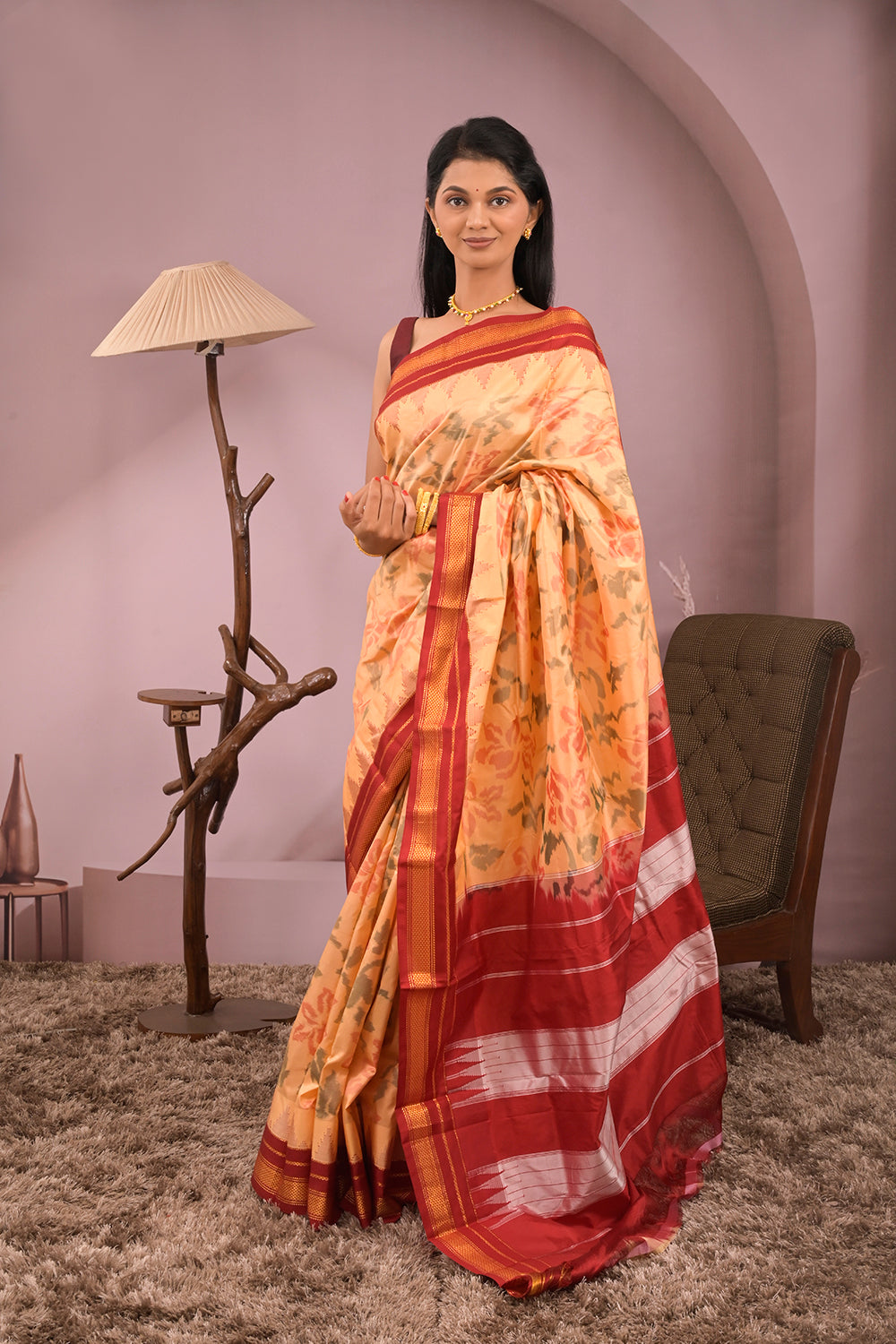 Elevate your ethnic collection with this Cream Silk Kolhapuri Ilkal Saree, showcasing the timeless charm of woven tie and dye Ikkat craftsmanship. The serene cream tone adds a touch of understated elegance, making it perfect for festive wear, traditional ceremonies, and cultural celebrations. Handwoven in premium silk, this saree blends luxurious texture with intricate artistry, offering a graceful drape for the modern connoisseur. Discover the essence of authentic Indian handloom heritage with this exclusive designer piece.