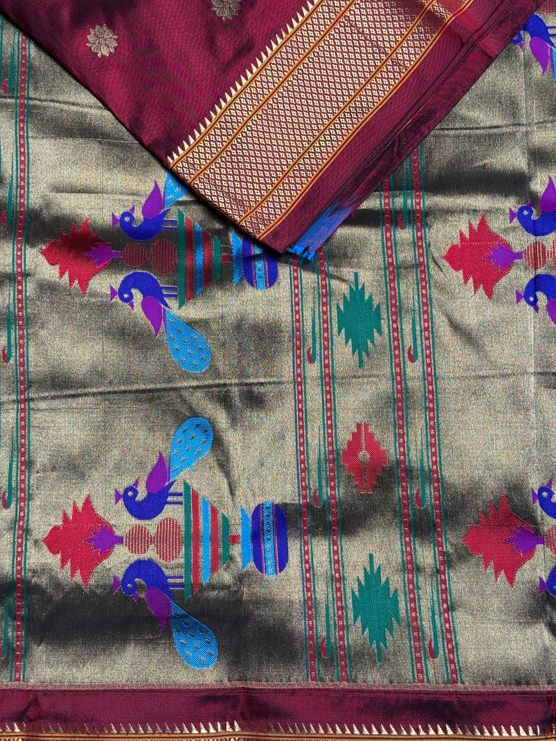 Elevate your ethnic style with this Maroon Kalanjali Paithani Pure Silk Saree. Crafted with intricate detail on premium silk, it embodies timeless tradition and sophistication. A perfect pick for weddings, festive occasions, and cultural events. Shop now for authentic Pure Silk Paithani sarees online.